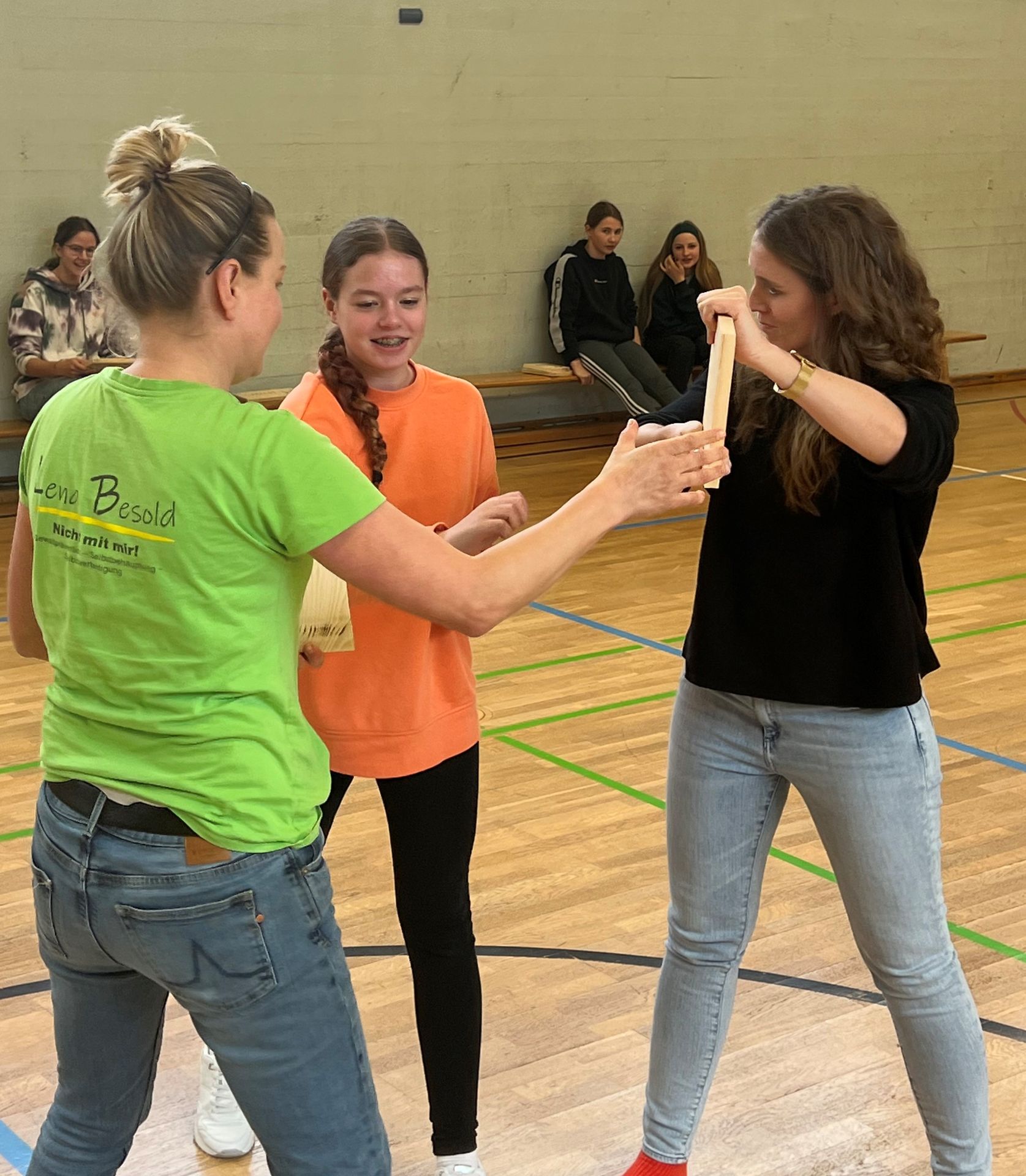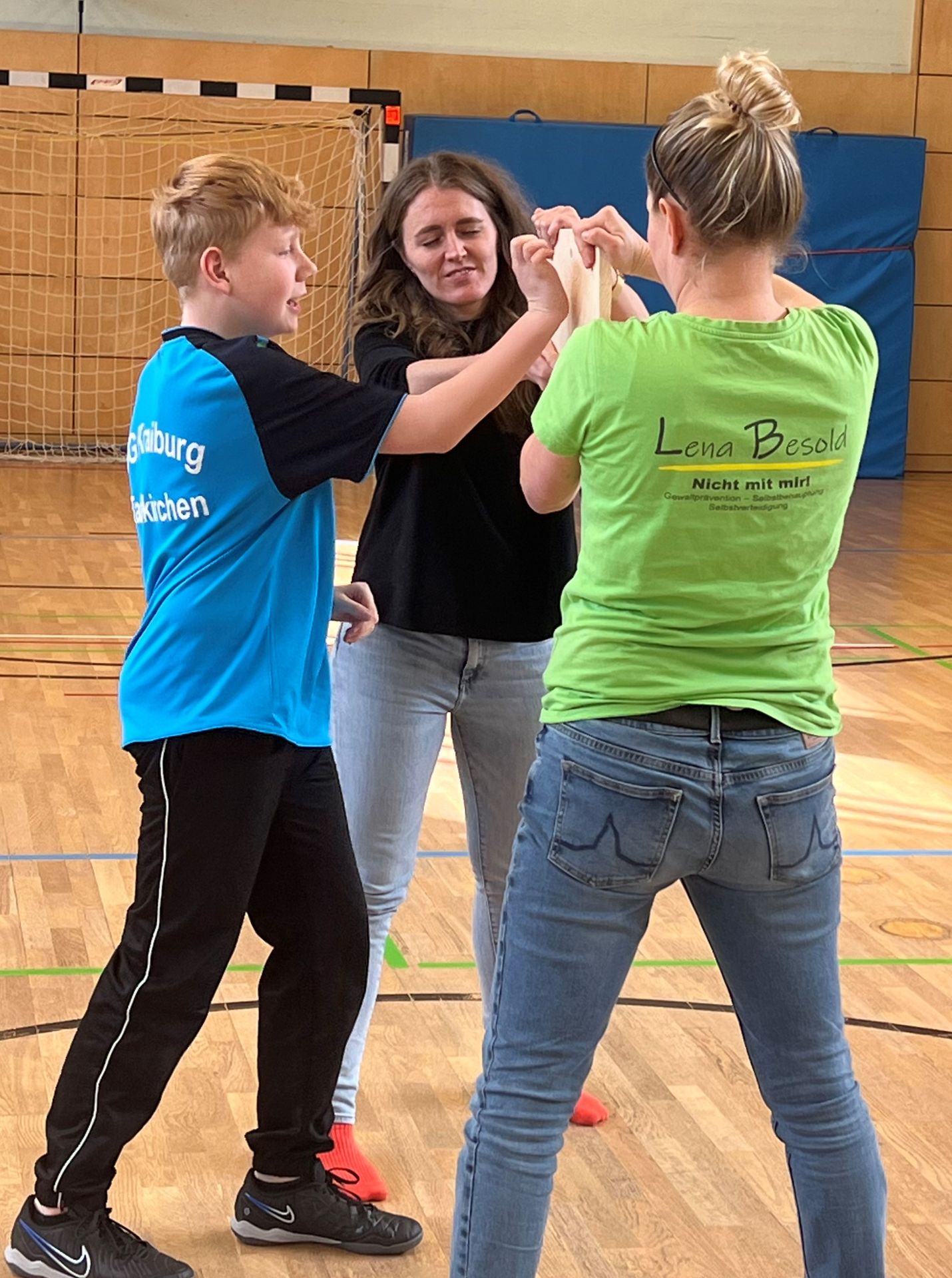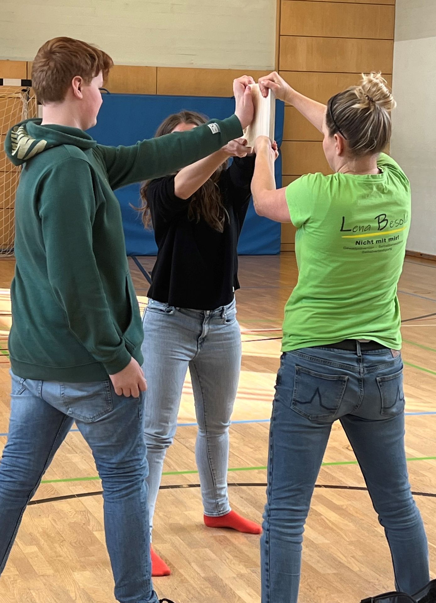 Das sollte im Idealfall die Einstellung eines jeden Jugendlichen sein, wenn es darum geht, im Ernstfall seinen eigenen Standpunkt selbstsicher zu vertreten oder sich gar zu verteidigen. Im Kursangebot „Nicht mit mir!“ lernte eine Gruppe von Achtklässlern an vier Terminen immer nachmittags, „dass rechtzeitig weglaufen nicht feige, sondern klug ist und dass Hilfe holen kein Petzen ist. Aber eben immer im Bewusstsein, dass es 100% Sicherheit nicht geben kann und, sollte doch einmal etwas passieren, man selbst nicht schuld ist“ (L. Besold). Als selbstständige Trainerin für Gewaltprävention, Selbstbehauptung und Selbstverteidigung und lizensierte Kursleiterin des Deutschen Ju-Jutsu Verbandes bietet Frau Lena Besold eben solche Kurse u.a. für Schulen an, wobei den Schüler*innen beispielsweise Inhalte zu den Themen Körpersprache, Zivilcourage, Verteidigung mit Worten oder verletzungsfreies Fallen vermittelt werden. Am Ende der Kurseinheit gelang es jedem Jugendlichen mithilfe des Handballenstoßes, der nur im absoluten Ernstfall anzuwenden ist, Holzbretter mit bloßer Eigenkraft zu durchbrechen. Toll gemacht und Kraft bewiesen – Glückwunsch an alle Teilnehmer*innen! Und ein herzliches Dankeschön für die erlebnisreichen Stunden an der Realschule an Lena Besold.