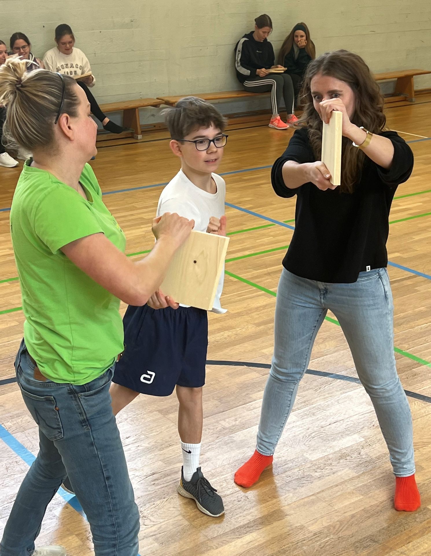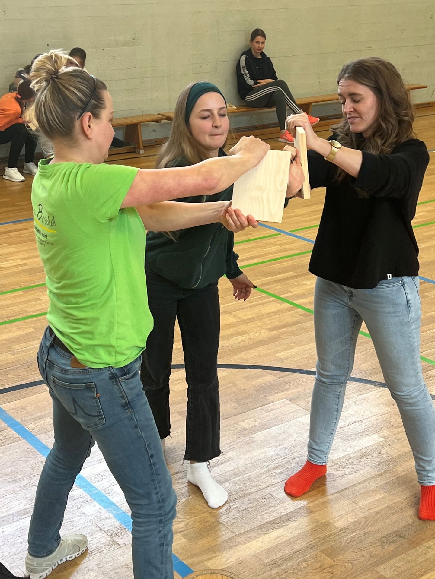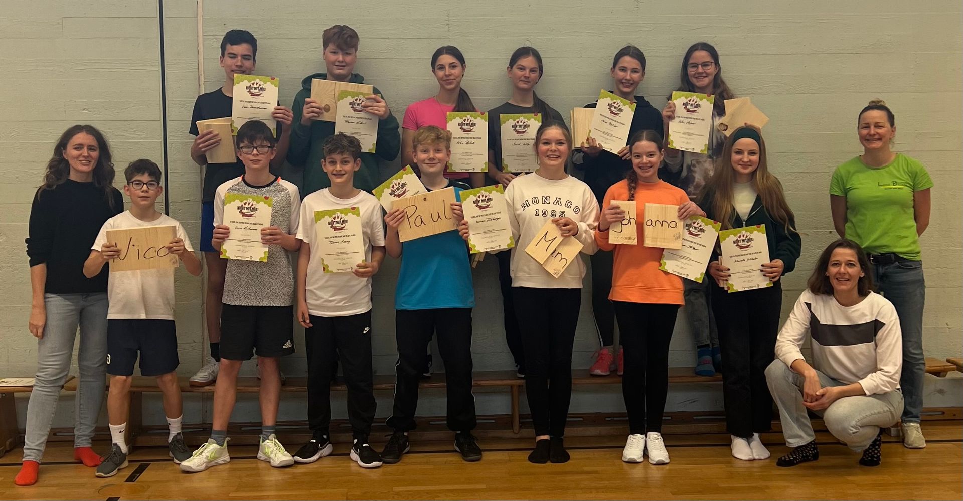 Das sollte im Idealfall die Einstellung eines jeden Jugendlichen sein, wenn es darum geht, im Ernstfall seinen eigenen Standpunkt selbstsicher zu vertreten oder sich gar zu verteidigen. Im Kursangebot „Nicht mit mir!“ lernte eine Gruppe von Achtklässlern an vier Terminen immer nachmittags, „dass rechtzeitig weglaufen nicht feige, sondern klug ist und dass Hilfe holen kein Petzen ist. Aber eben immer im Bewusstsein, dass es 100% Sicherheit nicht geben kann und, sollte doch einmal etwas passieren, man selbst nicht schuld ist“ (L. Besold). Als selbstständige Trainerin für Gewaltprävention, Selbstbehauptung und Selbstverteidigung und lizensierte Kursleiterin des Deutschen Ju-Jutsu Verbandes bietet Frau Lena Besold eben solche Kurse u.a. für Schulen an, wobei den Schüler*innen beispielsweise Inhalte zu den Themen Körpersprache, Zivilcourage, Verteidigung mit Worten oder verletzungsfreies Fallen vermittelt werden. Am Ende der Kurseinheit gelang es jedem Jugendlichen mithilfe des Handballenstoßes, der nur im absoluten Ernstfall anzuwenden ist, Holzbretter mit bloßer Eigenkraft zu durchbrechen. Toll gemacht und Kraft bewiesen – Glückwunsch an alle Teilnehmer*innen! Und ein herzliches Dankeschön für die erlebnisreichen Stunden an der Realschule an Lena Besold.