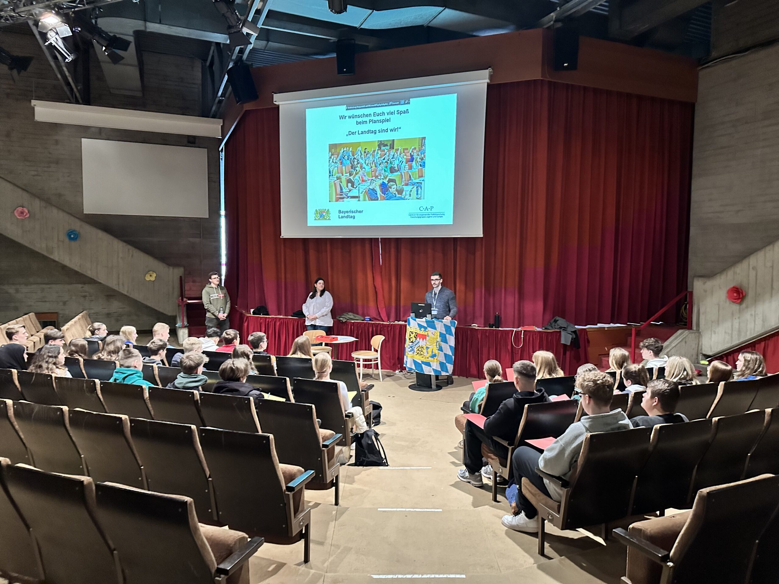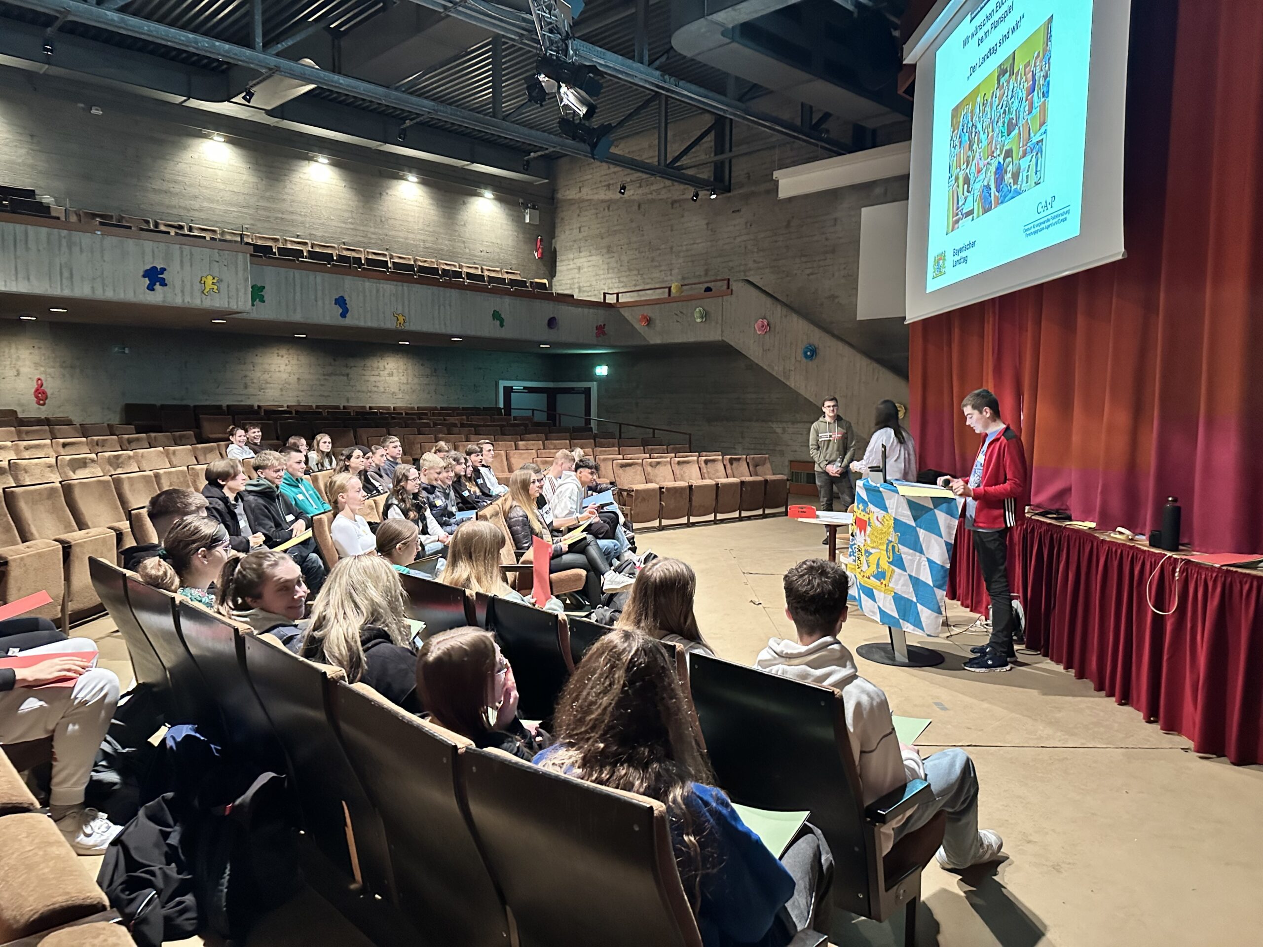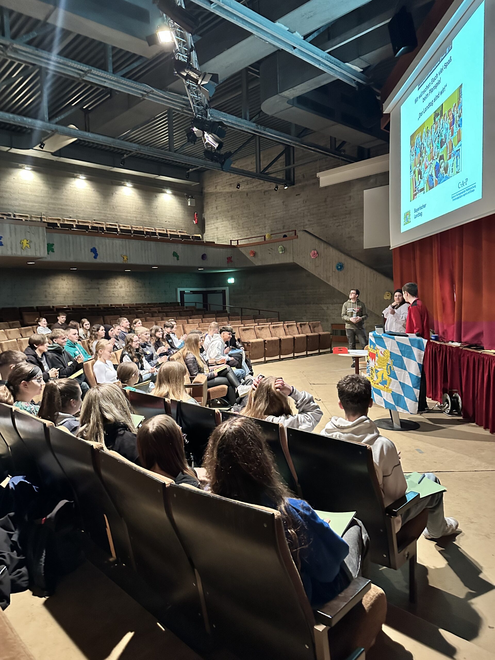 Am Freitag, den 22. März durften sich zwei Klassen der Realschule Waldkraiburg für einen Vormittag wie „die Großkopferten“ im Maximilianeum zu München fühlen. Der Plenarsaal wurde kurzerhand aus der Landeshauptstadt über den Weißwurst-Äquator nach Waldkraiburg – genauer gesagt – in das Schultheater verlegt. Wo sonst Theateraufführung zu sehen sind, Fortbildungen oder Lehrerkonferenzen abgehalten werden, agierten nun aufstrebende Landespolitiker.